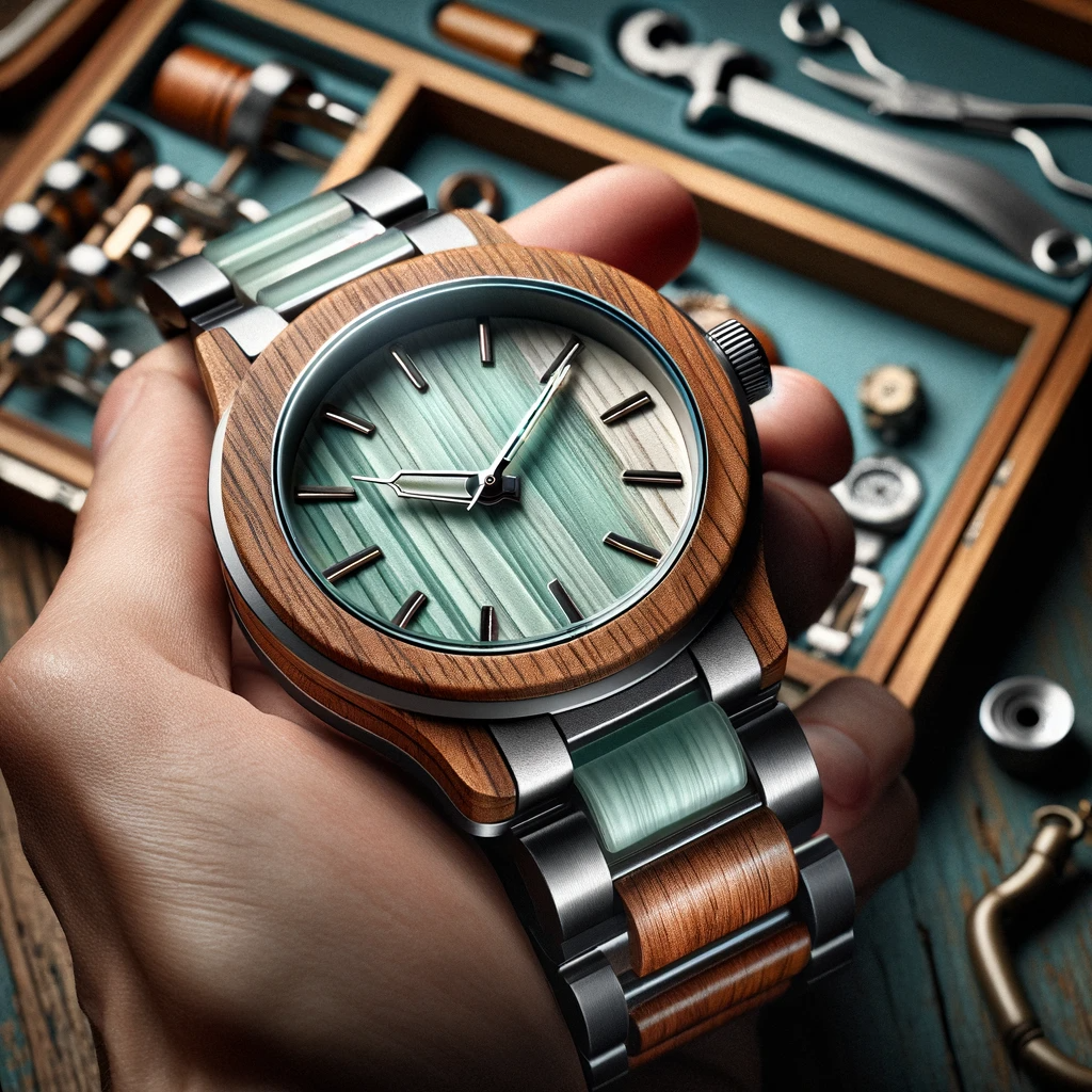 A men's wristwatch with the perfect blend of natural and modern design, it is crafted from a gently polished wood case to give off a natural look. The mint dial is made from high-quality paper and features a refined pattern, which is protected by transparent and sturdy glass. The metal elements on the watch are crafted from brushed stainless steel, providing a stylish look that contrasts with the warmth of the wood and paper. The watch band is an eco-friendly design with wooden links and metal accents, emphasizing the unique aesthetics of the watch. Combining the traditional way of making a watch with an innovative design, Nature's Harmony gives watch lovers a fresh and modern color combination. The watch is not just a time-measurement tool, but a unique piece of art that symbolizes the harmony of nature and technology.